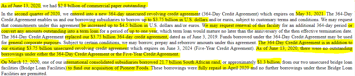 (5) 펩시는 지금 체결된 $3.75B 말고 다른 $3.75B규모 (총 $7.5B)의 신용대출이 있는것 같습니다.
