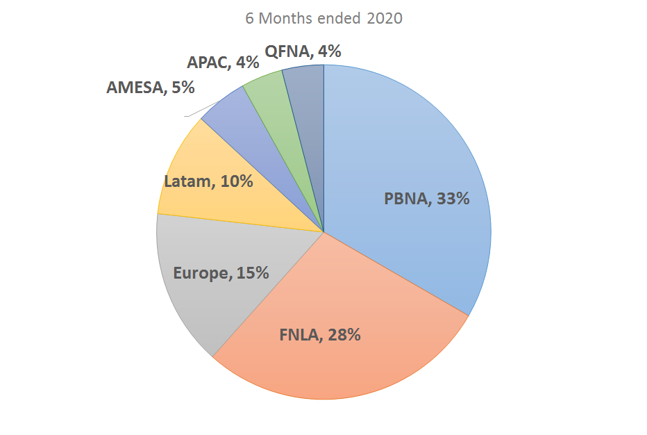 북미 사업분야를 자세히 보시면, Food & Snack과 시리얼 & 오트밀을 담당하고있는 FLNA와 QFNA의 영업이익율은 29.7%와 26.7%로 굉장히 높았지만, 음료사업 부문인 PBNA의 영업이익율은 7.1%로 가장 낮았습니다. 아마도 이 분야는 120년 라이벌인 코카콜라와 직접적인 경쟁으로 인한 출혈경쟁이 여전히 큰걸로 판단됩니다.