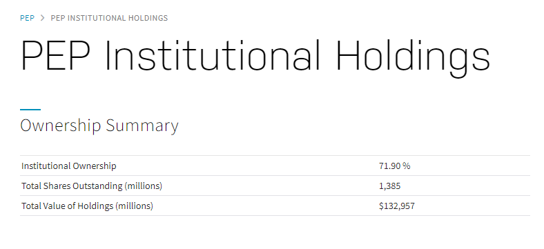 다음은 기관투자자들의 보유량입니다. 펩시의 기관투자자들 보유비율은 71.9%로 지금까지 분석한 회사중 가장 높았습니다 (2번째는 마이크로소프트 69.9%)