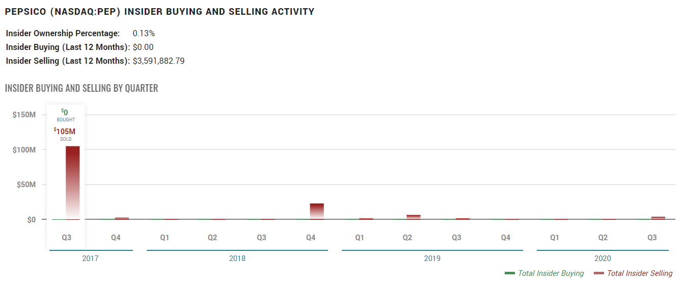 다음은 펩시의 최근 내부주식 판매차트입니다. 2017년도 3분기 많은 주식을 매도 후 최근 판매는 미미한것으로 보여집니다. 여기서 눈여겨볼점은, 펩시의 insider 지분보유량은 0.13%라는 점입니다. 120년간 운영되면서 펩시는 이제 그 누구의 개인 소유가 아닌게 된것 같습니다.