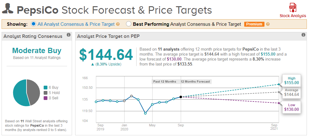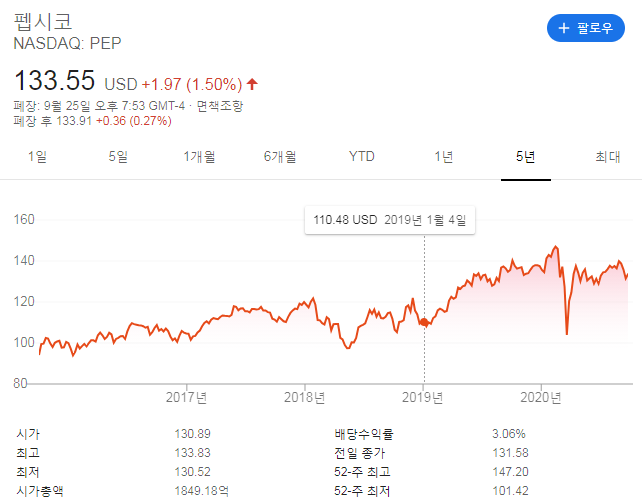 펩시의 5년차트입니다. 9/27/2020년 기준 $133.55이며, 이는 19년도 1월초 기준 약 20%가량 상승한 수치입니다. 최근 52주 기준 High @ $147.2 / Low @ $101.4 를 기록하였고, 고점대비 저점은 45% 가량 차이가 있었습니다.