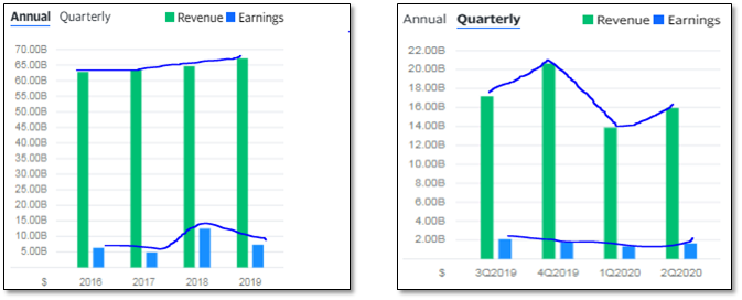 펩시는지난 4년간 큰 변동없이 꾸준한 매출기록을 보여주었는데요, 최근 4분기 기준으로 보면 19년도 고점을 찍은후 코로나의 영향으로 다소 내려간 것으로 보여집니다. 하지만 매출액 감소에비해 Earning에는 큰 타격이 없어보이는게 긍정적입니다.