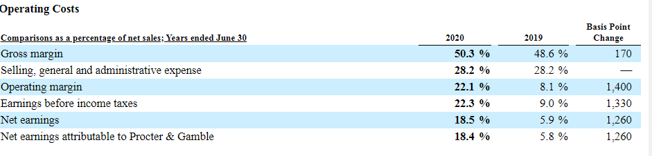 지난 4년간 P&G의 매출은 성장율은 둔화되었으나 약소한 우상향 모습을 보여주고 있었으나, Earning에는 변동이 많아 보였습니다. (이부분은 아래의 Income Statement에서 간단하게 다룰 예정입니다.) 다행히 2020년도의 Earning은 큰폭으로 증가하는 모습 보여주었네요.