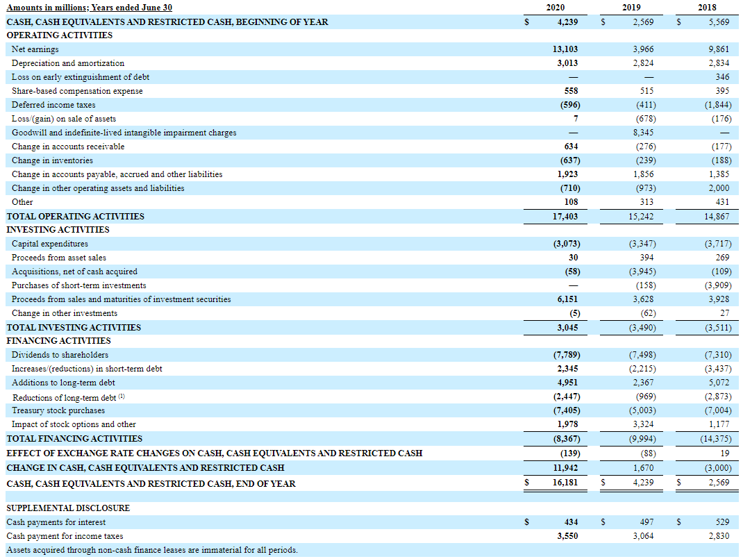 최종적으로 P&G의 현금은 119억불 증가하며 20년 6월말 기준 162억불의 현금을 기록하였습니다. 전년말의 42억불에 약 4배가량 증가한 현금수준이네요. 현금을 원기옥급으로 모아놨는데요.. 이 현금을 향후 어디에 사용할지 기대가 됩니다. 아마 조만간 인수합병 소식이 들려올것 같네요.