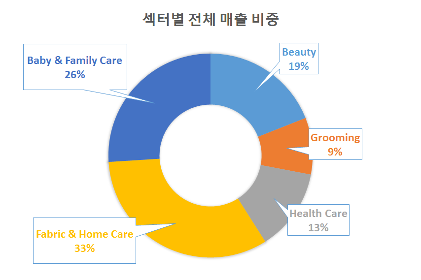 (5) Baby, Feminine & Family Care: 펨퍼스 기저귀를 포함한 다양한 아기용품, 여성용품 및 휴지제품등을 포함하며, 전체 매출의 26%를 차지합니다.