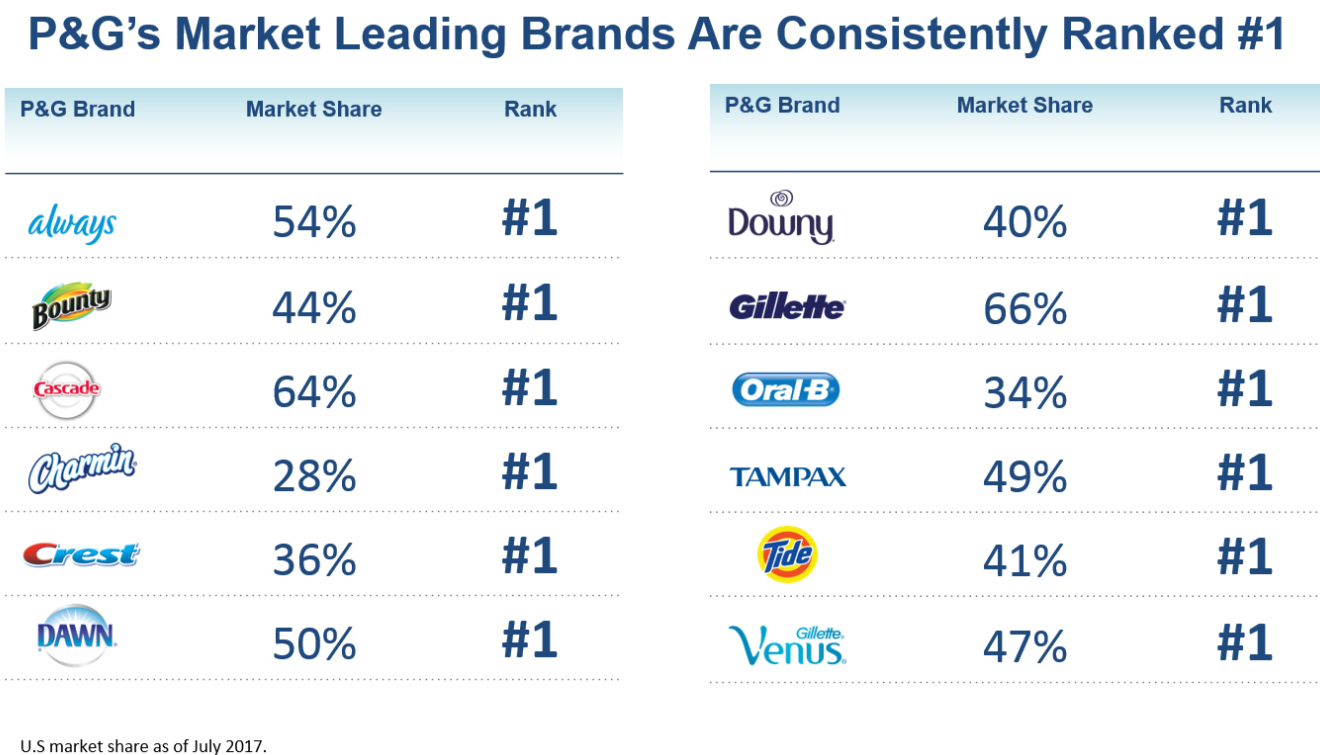 P&G가 보유하고있는 브랜드들은 위와 같은데요 (실제로는 더 많은데 다 담을수가 없었습니다), 더 놀라운것들은 이 브랜드들의 시장 점유율 입니다. 아래는 2017년 7월기준 각 브랜드들의 시장 순위와 시장 점유율입니다. 모두 압도적인 점유율로 시장 1등을 유지하고 있지요?