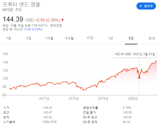 P&G의 5년차트입니다. 10/17/2020년 기준 $144.39로마감하였으며, 이는 코로나로 폭락한 19년도 3월의 $102.43기준 약 41%가량 증가한 수치입니다. 최근 52주 기준 High @ $145.87 / Low @ $94 를 기록하는 등 저점대비 고점은 55% 상승하였고, 주가는 코로나 이전 수준을 훨씬 상회하였습니다.