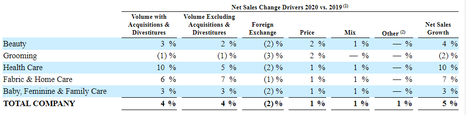 전체 매출은 전년도 대비 5%오른 $70B (80조원)을 기록하였는데, 매출 상승의 원인으로는 Health Care의 두자릿수 매출상승이 가장 컸지만, 나머지 섹터들도 꾸준히 매출상승을 이루었다고 합니다 (Grooming 제외).