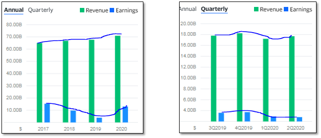 좌측은 연간 (2017-2020), 우측은 분기 (19'3 - 20'2) 매출과 어닝 현황입니다.