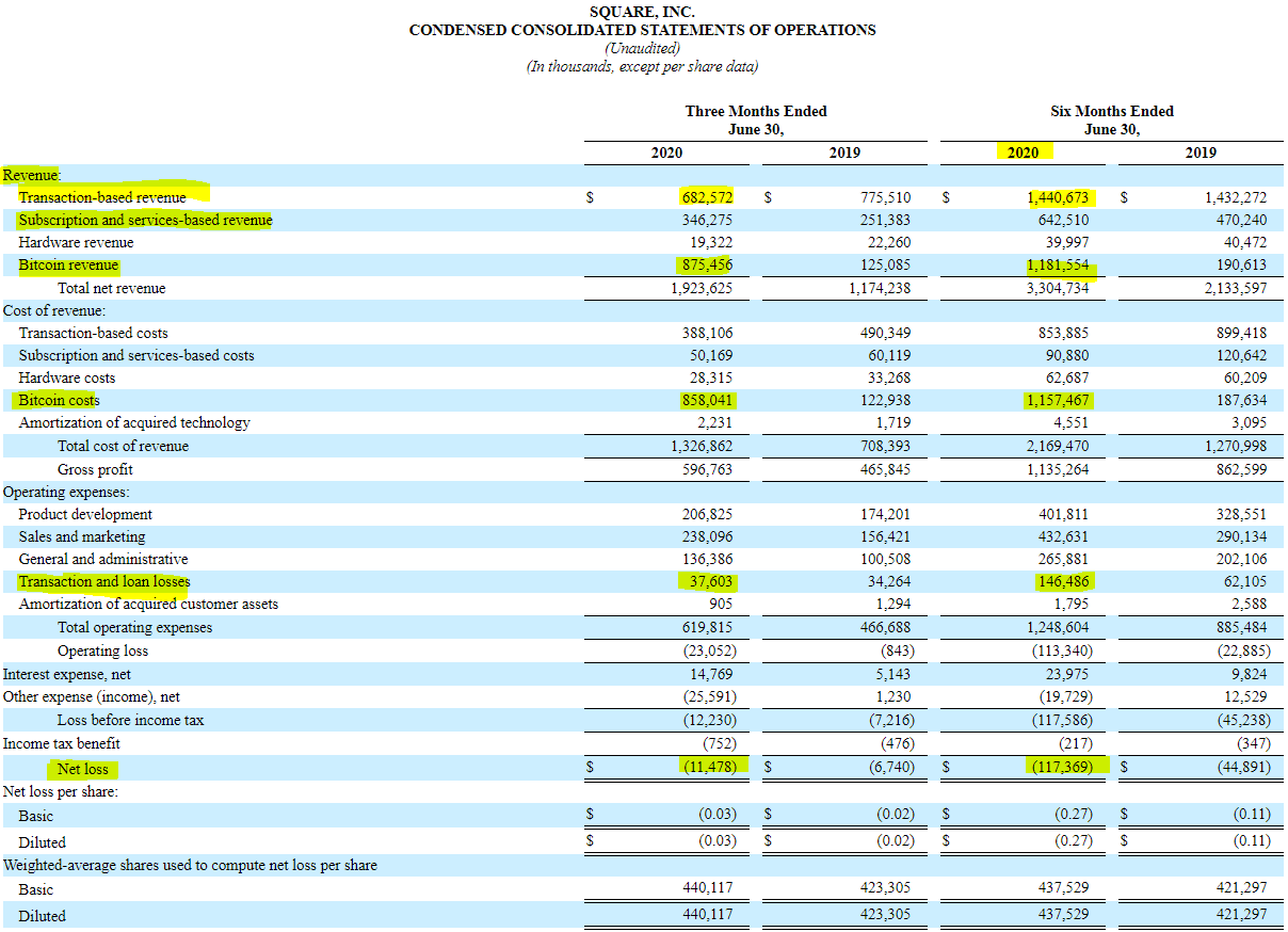 10-Q에서 제공된 스퀘어의 Income Statement입니다.