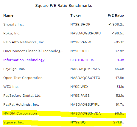 다음은 스퀘어의 PER입니다. 271.9배를 기록하며 시장의 엄청난 고평가를 받고있는데요, 이 수치는 NVIDIA의 99.5배보다도 약 3배 조금 안되게 높은 수치입니다. 개인적으로 NVIDA의 잠재성보다 더 높게 평가받는다는것은 이해가 안갑니다.