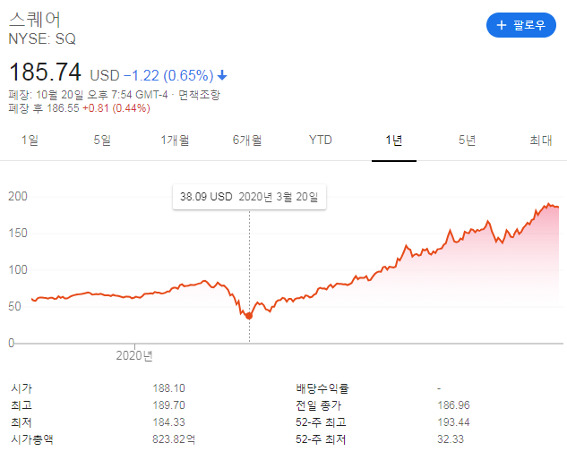 스퀘어의의 1년차트입니다. 10/20/2020년 기준 $185.74로마감하였으며, 이는 코로나로 폭락한 20년도 3월의 $38.09 기준 약 4.8배가량 증가한 수치입니다. 최근 52주 기준 High @ $193.44/ Low @ $32.33 를 기록하는 등 저점대비 고점은 498% 상승하는 등 최근들어 스퀘어의 가치가 폭발적으로 증가하였습니다.