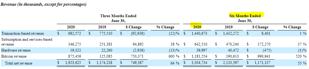20년도 2분기 기준, 비트코인의 매출이 Transacation의 매출을 넘기며 스퀘어의 No.1 사업부문이 되었구요.
