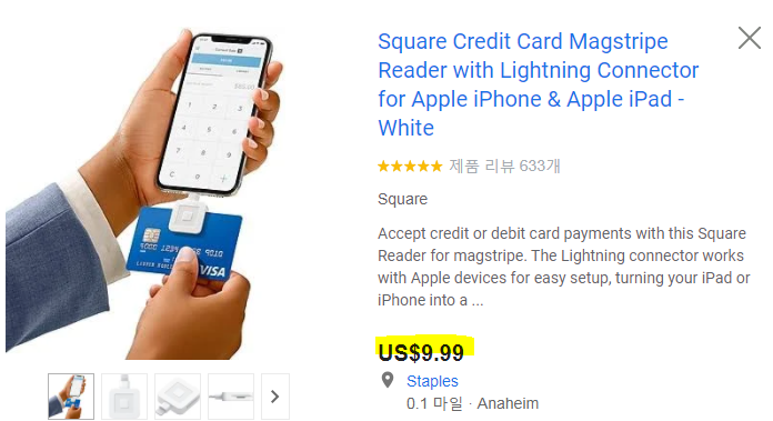 참고로 가장! 저렴한 결제 제품의 판매정보를 스크린샷 했는데요.. 핸드폰 이어폰잭에 꼽아 사용하는 스퀘어의 이 제품은 단돈 $9.99에 판매되고 있네요! 이쯤되면 모두가 장사를 할 수 있겠어요 ㅎㅎ