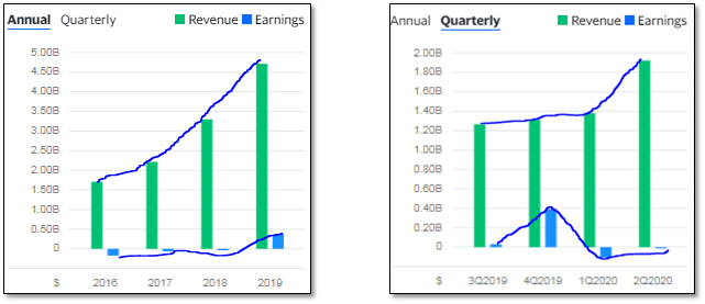 좌측은 연간 (2016-2019), 우측은 분기 (19'3 - 20'2) 매출과 어닝 현황입니다.