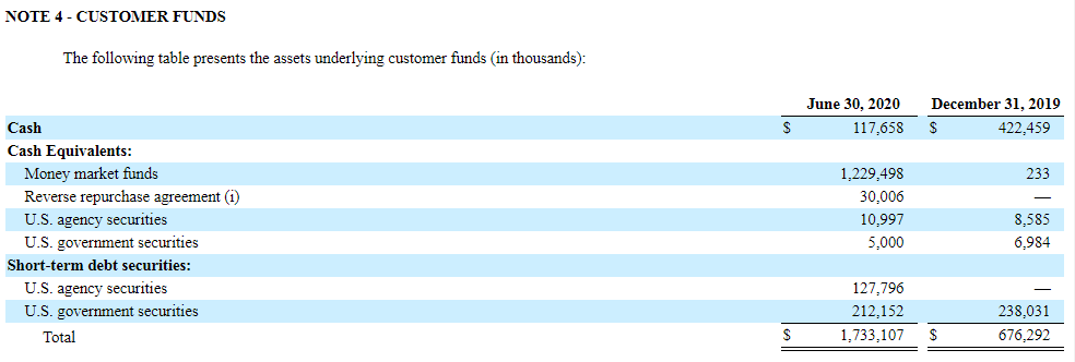 자산에 Customer Funds라는 계정이 있는데, 이것은 고객들이 스퀘어의 'Cash App' 등에 넣어두는 예치금 등으로 스퀘어는 이 돈의 대부분을 유동성이 좋고 조금이나마 수익도 있는 Money Market Funds로 넣어놨습니다.
