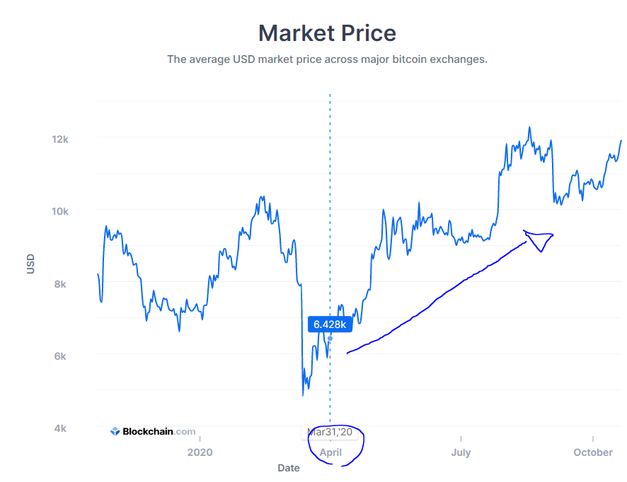 아래의 차트는 비트코인의 최근 가격 변동표입니다. 2020년 4월 (2분기 시작)부터 비트코인의 가격이 크게 늘어난 것으로 보입니다. 아마 이로인해 비트코인의 매매가 더 활성화 되면서 스퀘어의 비트코인 사업부문 매출이 더 커진것이라고 추측할 수 있습니다.