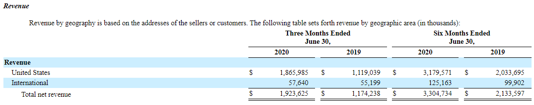 20년 상반기 기준 전체 매출의 96.2%는 미국에서 발생하였는데, 전년도 95.3%대비 1%가량 더 증가한 수치입니다. 해외 매출이 25.3% 증가하였음에도 불구하고, 미국의 매출이 56.3% 증가하여 미국의 매출비중은 더 커졌습니다.