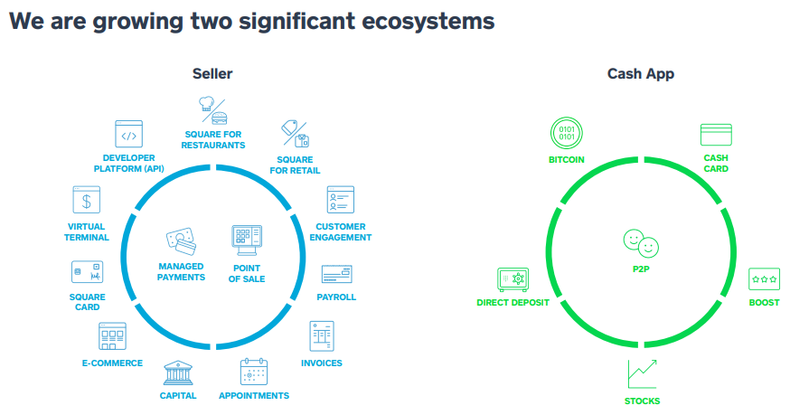 위의 표는 스퀘어의 사업부문을 보기 쉽게 나타내는데요, 스퀘어는 크게 'Seller' 와 'Cash App' 두가지 부문의 사업을 영위하고 있습니다. 'Seller'는 위에서 설명한 POS와 관련된 사업으로, 고객(개인, 상인, 기업등)이 비지니스를 운영할때 필요한 다양한 서비스 (POS, Payroll, Invoice, 크레딧카드, 대출 등등)을 제공하는 비지니스이고, 'Cash App'은 송금서비스와, 투자 등 다양한 금융서비스를 제공하는 비지니스 입니다.