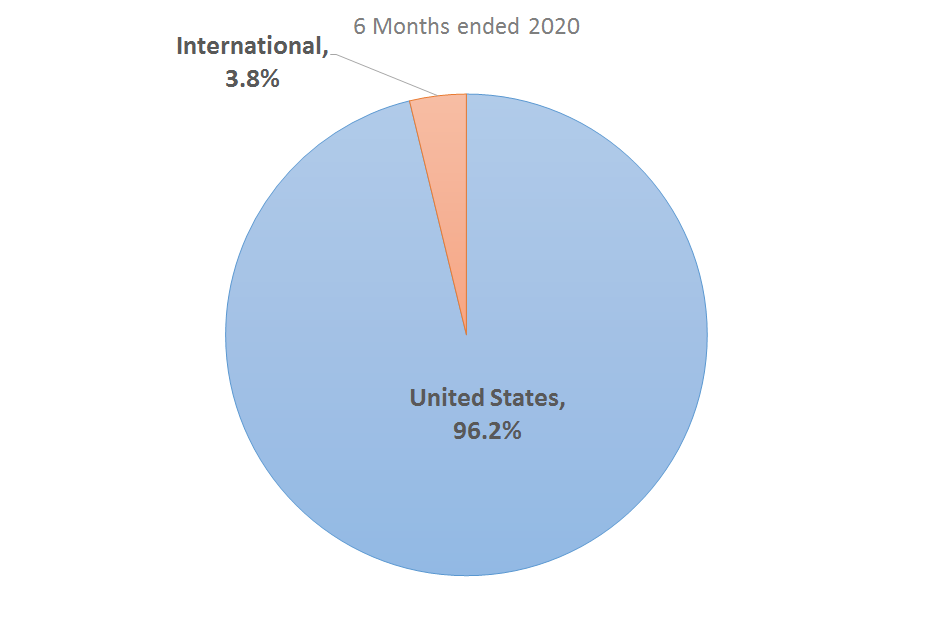 20년 상반기 기준 전체 매출의 96.2%는 미국에서 발생하였는데, 전년도 95.3%대비 1%가량 더 증가한 수치입니다. 해외 매출이 25.3% 증가하였음에도 불구하고, 미국의 매출이 56.3% 증가하여 미국의 매출비중은 더 커졌습니다.