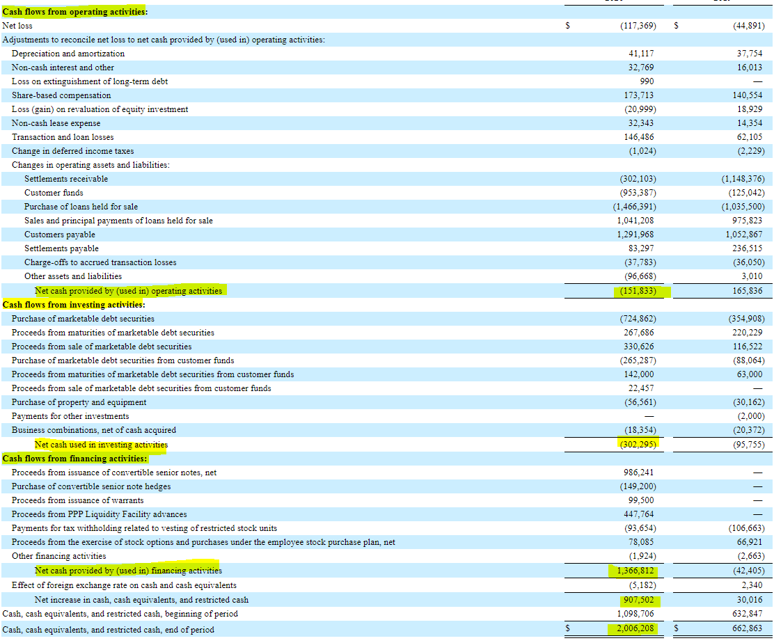 Operating Activities로 1.5억불 감소 - 순적자 1.1억불로 인한 순적자가 치명적이였지만, 사실 이번 1.5억불 감소에는 나름 변명의 여지가 있습니다. 위에서 설명한대로, 스퀘어는 이번에 약 4억불 가량의 PPP 대출지원을 했는데요, PPP 지원으로 인해 일시적인 현금감소로 영업활동에서는 현금흐름 타격이 조금 더 커보입니다. 그런데 이 금액은 아래의 Financing Activity에서 다시 Add-back 되니 일시적인 마이너스로 볼 수 있을것 같습니다. 하지만 어찌됬든 순적자 1.1억불은 타격이 크지요?